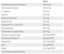 Collagen Boozt is een vloeibare formule met kersensmaak die hoge concentraties bevat van twee belangrijke ingrediënten: zeecollageen en hyaluronzuur. Zeecollageen is afkomstig van vis en staat bekend om zijn hoge biologische beschikbaarheid en potentieel om de huidstructuur en -elasticiteit te verbeteren, terwijl hyaluronzuur wordt gewaardeerd om zijn vochtvasthoudende eigenschappen van de huid.